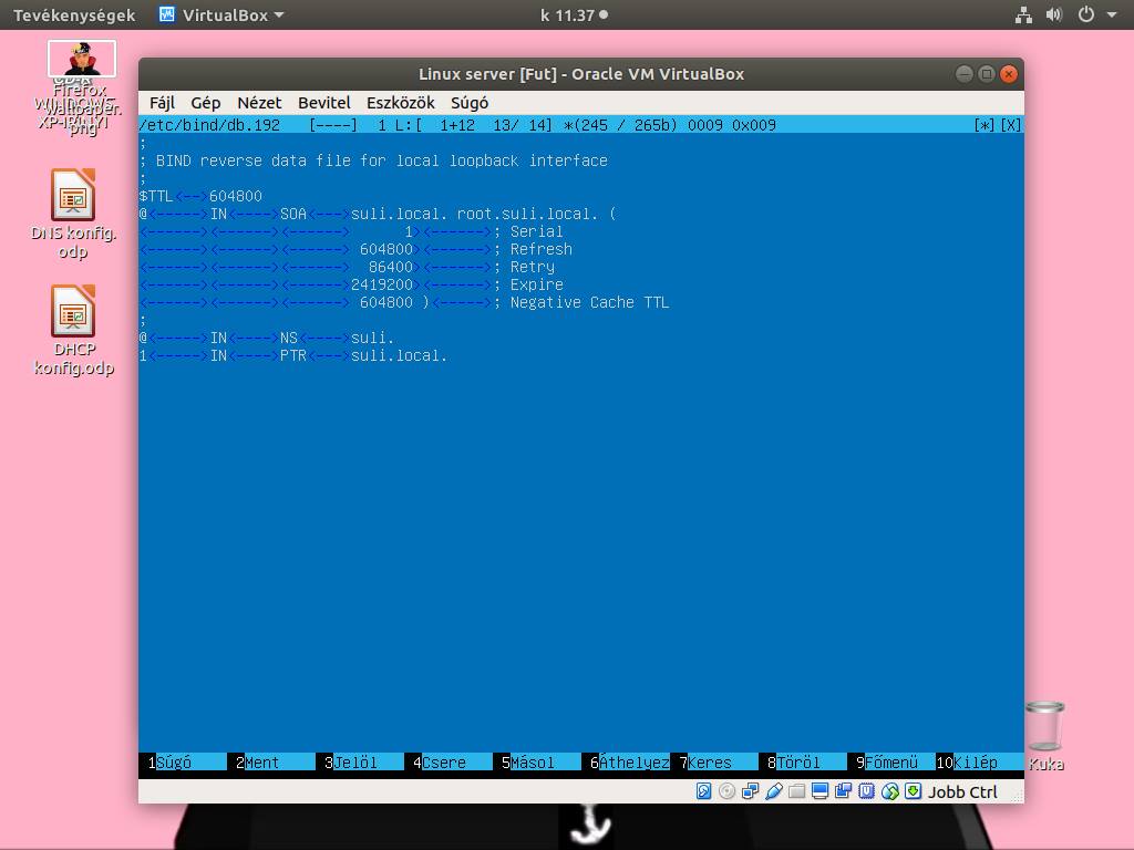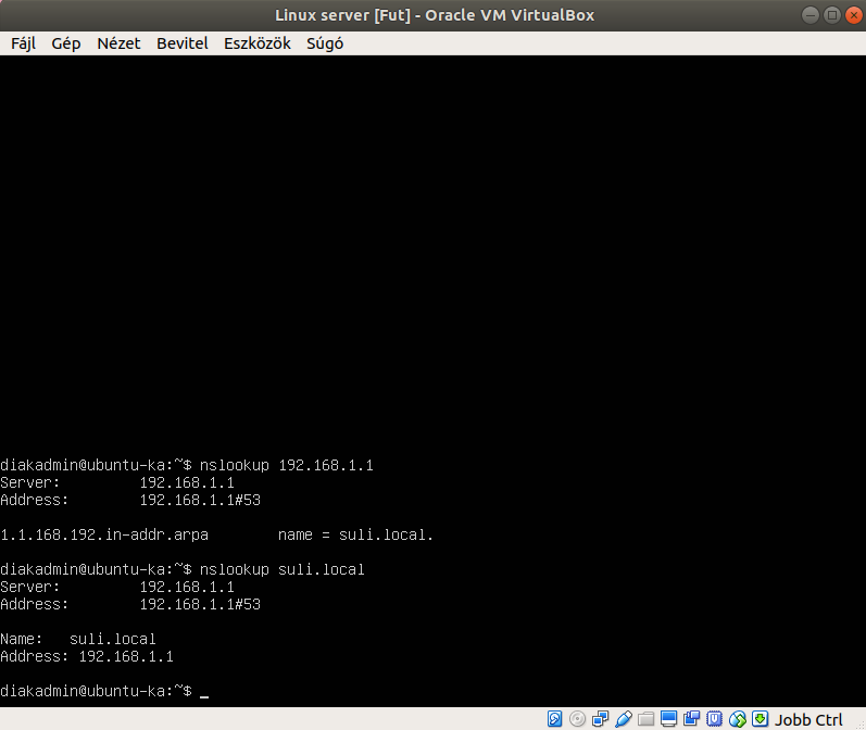 Ha minden lépést jól csináltunk, akkor a DNS szerverünknek sikeresen kell működnie. A DNS működését az nslookup parancs segítségével tudjuk tesztelni. A parancs használata során nevet vagy IP címet is tudunk használni, használata: nslookup 172.16.1.1 vagy nslookup suli.local Ezen kívül a működési tesztelés a következő parancs segítségével végezhető el: named -4 -g