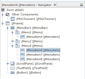 Létrehozunk egy új Java projektet, de nem pipáljuk be a main metódust. A megnyitott projekthez új jFrameForm osztályt adunk jobb egérgombbal, majd futtatjuk. Futtatásnál a main metódusnak a jFormot jelöljük. Így már lett egy üres Formunk (programablakunk). A Formon elhelyezel egy menübárt, majd a file menüben egy open menüitemet hozol létre. Ezzel szeretnénk a fájlunkat megnyitni illetve ehhez megjeleníteni a dialógusablakot. A komponensekhez hozzáadsz még egy FileChooser komponenst is, ezt Netbeansban a legkönnyebben úgy teheted meg, ha a designe fülön a projekt felett "elejted" a komponenst, így az az Other Componentekhez kerül, nem kerül fel a panelra. Szükséged lesz még egy TextArea-ra is. Erre kellene kiírni a fájlban található szöveget. Esetleg feltehetsz még egy jTextField komponenst szövegbevitelre, illetve egy gombot, ha keresni szeretnéd a bevitt szövegrészt a TextArea1 szövegében.