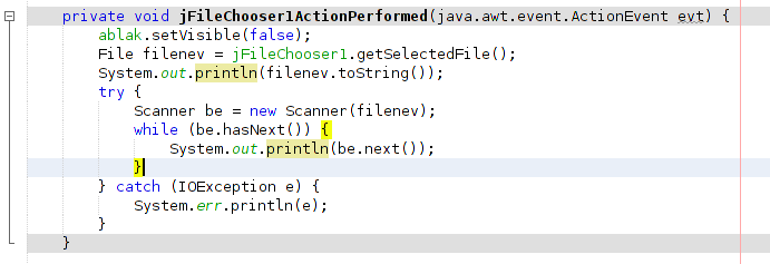 Létrejön a kódban a jFileChooser1ActionPerformed metódus. Magának a fájl beolvasását, és a dialóg ablak eltüntetését már ebben a metódusban végezzük: