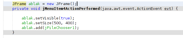 A menüdben a menüitemet open-re nevezed, majd erre kettőt kattintva létre jön a jMenuItem1ActionPerformed metódus. Szükséged lesz még egy globális változóra is: ablak. Ez a dialógablakhoz kell, mivel ennek a visible tulajdonságát állítod igazra vagy hamisra a megjelenítéshez.