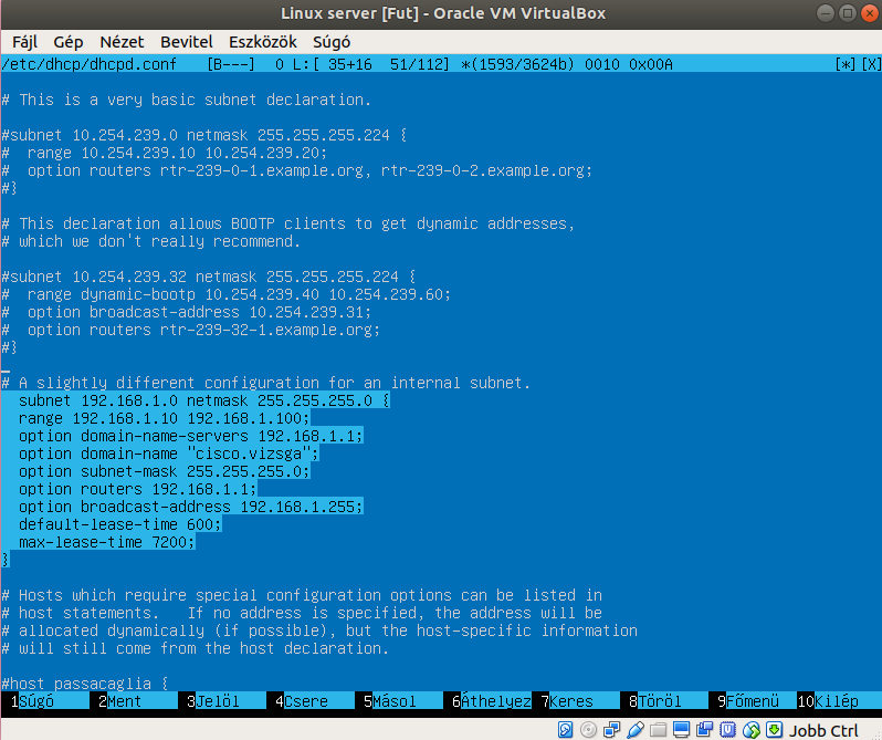 default-lease-time 600; → alap bérleti idő (másodpercben megadva, 10 perc)